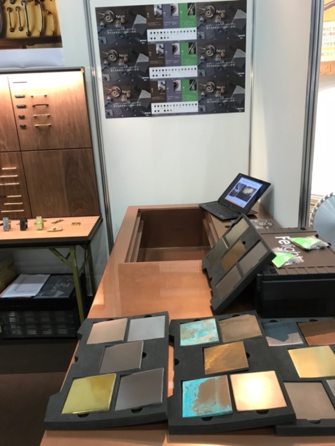 弊社は去年の建具フェアでもフェライトを展開しておりましたが、今回は木製の天板に銅の塗装をして磨いたカウンタートップを置くことで、より迫力のある塗装を見ていただけたかなと思います。